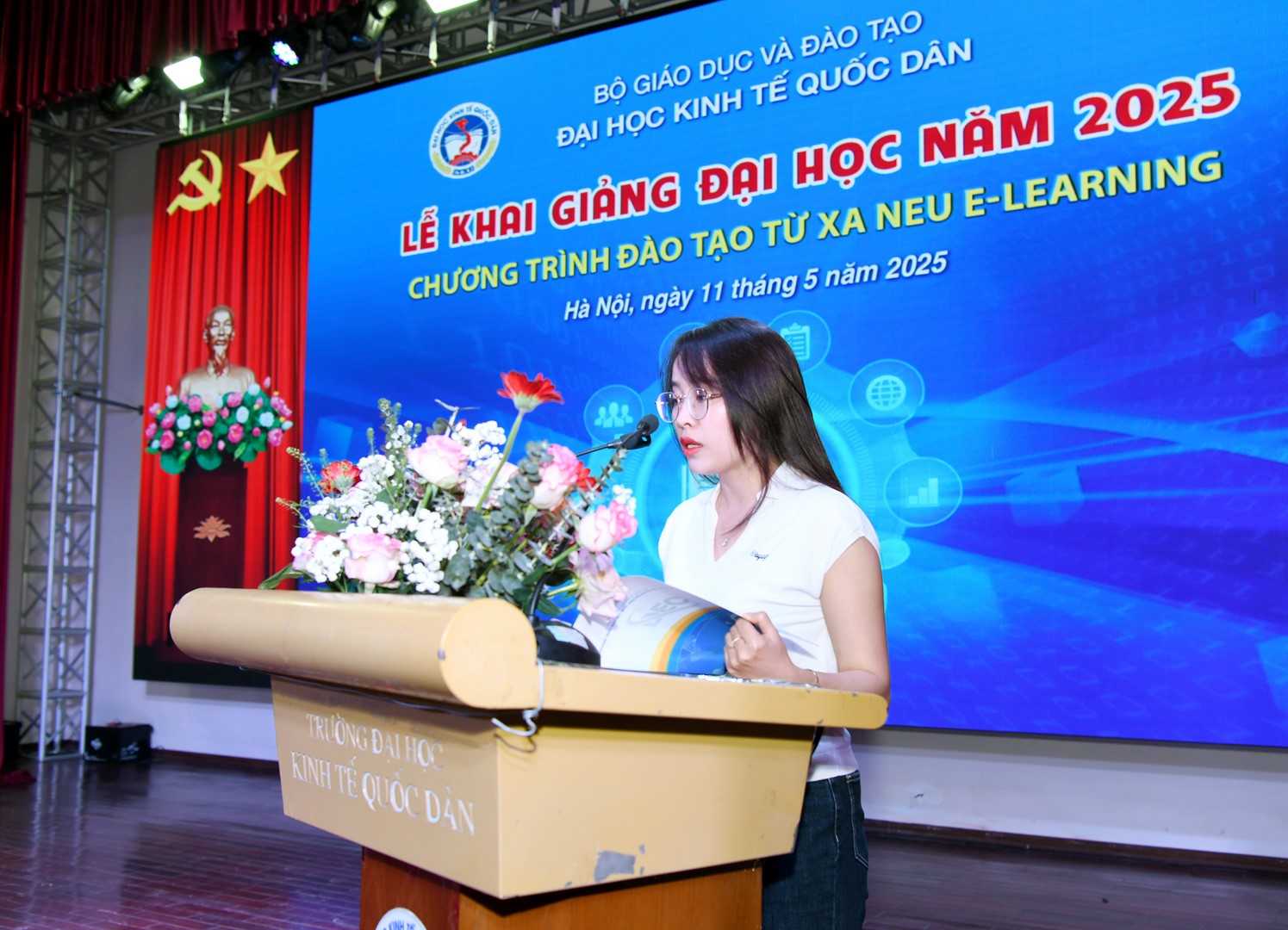 Phát biểu tại buổi lễ, tân sinh viên Vũ Thị Minh Hương xúc động chia sẻ: Trong giờ phút đánh dấu hành trình mới này, chúng em vô cùng xúc động và hãnh diện khi chính thức trở thành sinh viên Đại học Kinh tế Quốc dân. Càng tự hào hơn nữa vì khóa chúng em sẽ được chứng kiến và mong muốn được tham dự Lễ kỉ niệm 70 năm thành lập của Đại học, lễ kỷ niệm 20 năm thành lập Trung tâm Đào tạo từ xa.