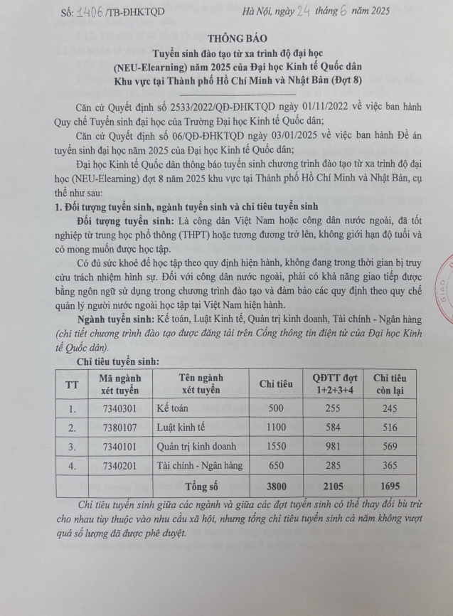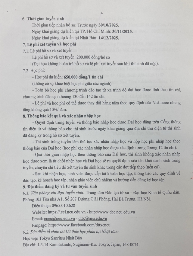 Tuyển sinh đào tạo từ xa trình độ đại học (NEU-Elearning) năm 2025 của Đại học Kinh tế quốc dân khu vực Nhật Bản và miền Nam tại Thành phố Hồ Chí Minh